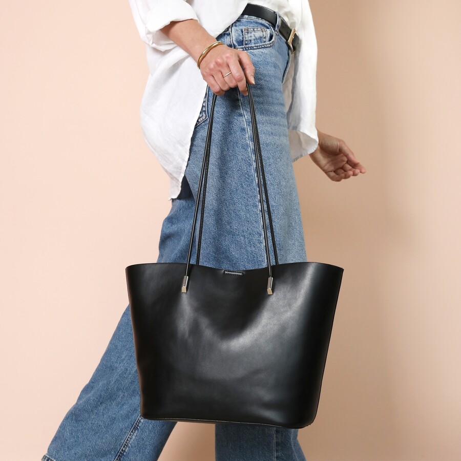 Black Vegan Leather Over Shoulder Tote Bag and Pouch