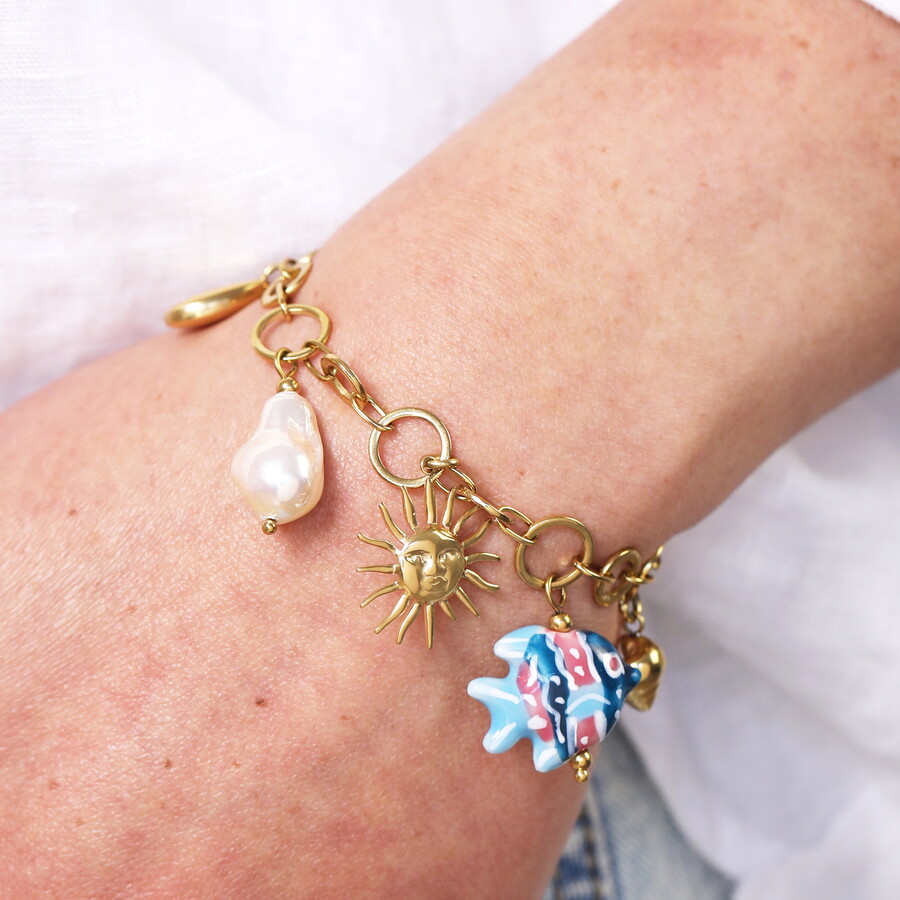 Made from: 14ct gold plated stainless steel, organic pearl, glass